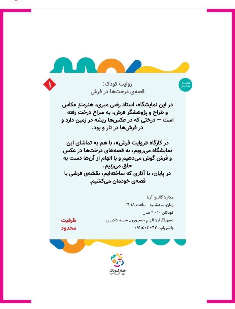 📍 محل برگزاری: [گالری آریا]🗓️ زمان: [ساعت: ۴-۶ سهشنبه، ۶ آبان ماه]👧🧒 مناسب برای: کودکان ۶-۱۰ سال
