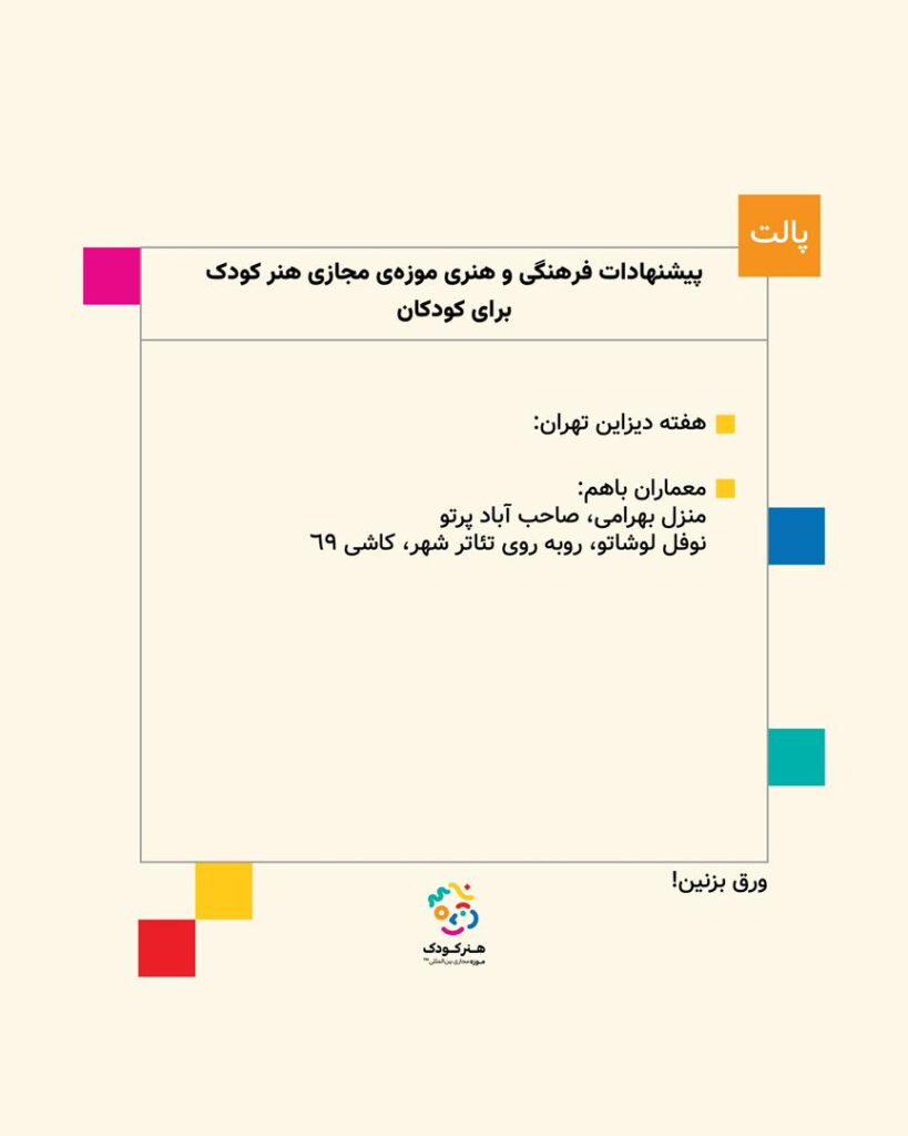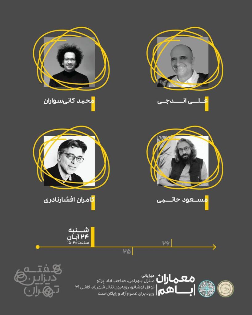 انجمن معماران «باهم»، روز شنبه ۲۴ آبان‌ماه را به برگزاری سه کارگاه کودک اختصاص داده است؛ هر یک از این کارگاه‌ها با راهبری یکی از معماران، علی اندجی، مسعود حاتمی و کامران افشار نادری، برگزار می‌شود.