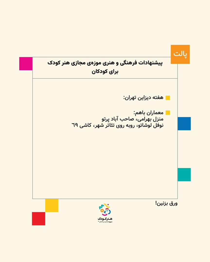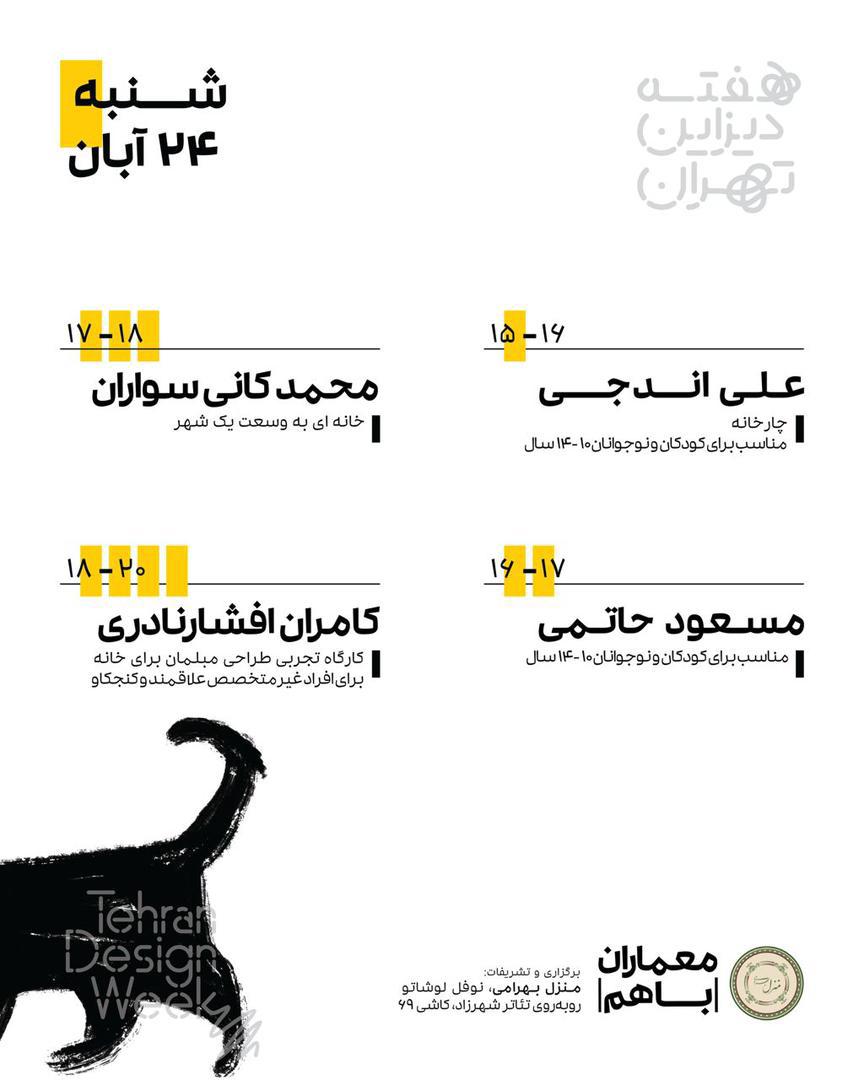 انجمن معماران «باهم»، روز شنبه ۲۴ آبان‌ماه را به برگزاری سه کارگاه کودک اختصاص داده است؛ هر یک از این کارگاه‌ها با راهبری یکی از معماران، علی اندجی، مسعود حاتمی و کامران افشار نادری، برگزار می‌شود.